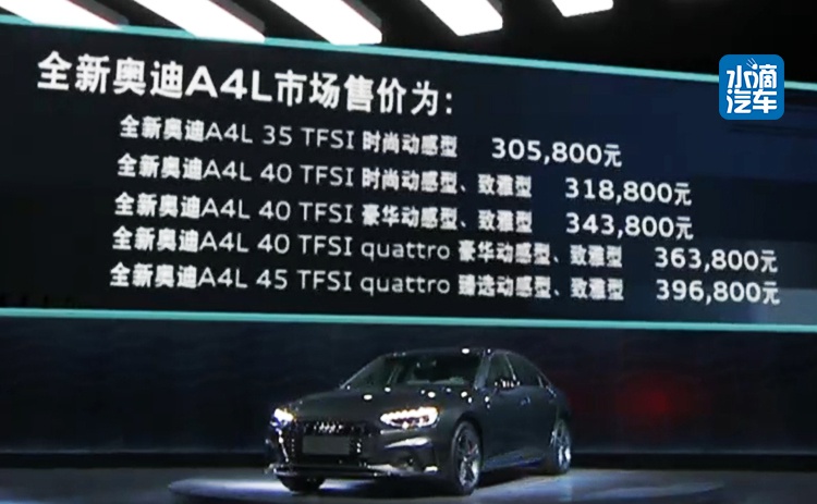 今日,全新奥迪A4L正式上市,共推出9款车型,售价30.58万-39.68万元。新车推出致雅型和动感型两种外观设计。动力部分全系匹配2.0T发动机,提供低、中、高三种调校版本。标配7速 Stronic智能变速箱,并带有12V微混系统。