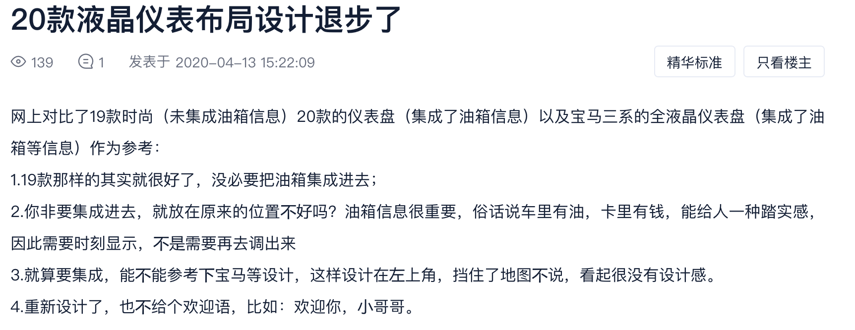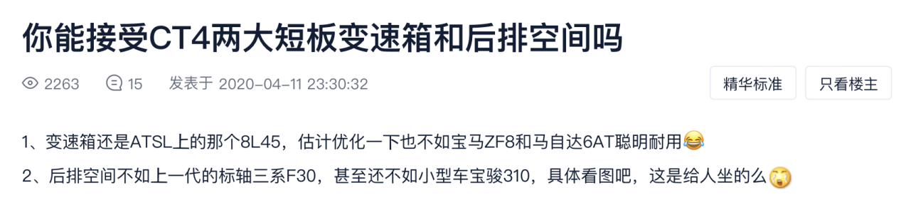 而在CT4论坛里呈现出的则是完全另一种画风。CT4虽然错位战打得很漂亮,但在产品力上同样存在很明显的短板,那就是空间。相比后排有没有空调出风口,一辆车的空间如何对于消费者的选择起着决定性因素,也是一辆车的硬伤。因此CT4论坛里讨论的多是“要不要为了后驱放弃实用性”或者“CT4后排真的不能座人,但还是好像要一辆四驱车”这样“大是大非”的问题。