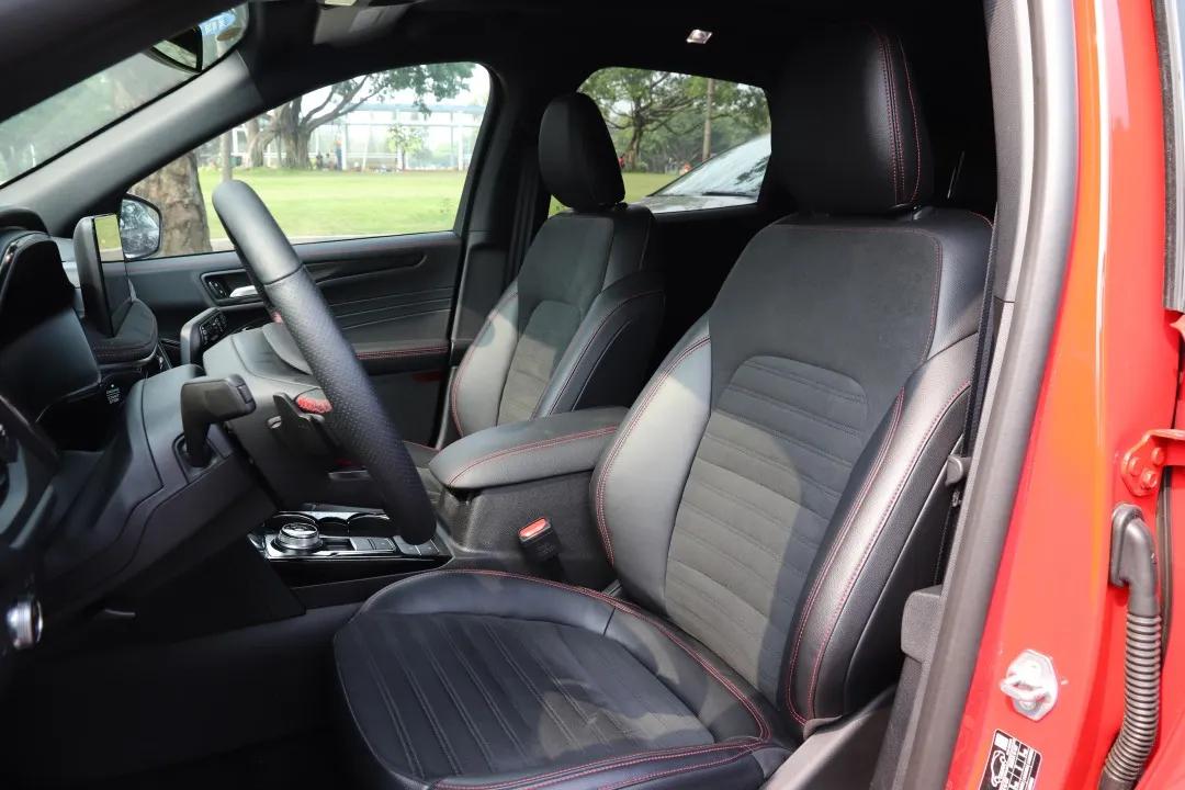 锐际在追求硬核运动的风格上并不止于此,在顶配的ST—Line版本车型上,锐际的真皮方向盘在3、9点部位采用了打孔设计,中控区辅以翻毛皮材质,以及前后排座椅都采用了真皮+翻毛皮的混搭,坐感舒适且前排座椅的包裹性也令人满意。除此之外,后排座椅还可以大范围的前后移动,虽然这个配置为选配,但试过之后我猜测没有人会对这项配置说不。