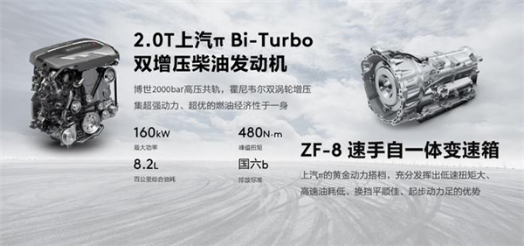在动力方面,上汽MAXUS D90 Pro的动力总成配备了面向全球研发的上汽π2.0T Bi-Turbo双增压柴油发动机,它采用霍尼韦尔双涡轮增压器,小涡轮解决低速动力迟滞,大涡轮动力更强,整体性能达到主流3.0T发动机水平;全系配备埃孚8AT手自一体变速箱,配备博格华纳N356加强型分动箱,最大扭矩为480牛·米。同时,上汽MAXUS D90 Pro搭载的上汽π2.0T高性能柴油发动机诸多关键零部件进行过NVH专项优化,以达到媲美同级汽油产品的静音表现。