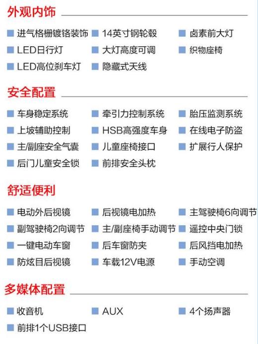 至于哪款车型值得买呢,我们就给大家详细解读一下四款车型的配置,首先是6.58入门版的手动进取型,它是全系最低配车型,标配14寸钢轮毂且后轮为鼓刹,LED日行灯、刹车灯为标配,车身稳定系统、牵引力控制、胎压监测等辅助安全配置为标配,电动后视镜、后视镜加热、主驾六项调节等配置也是标配。