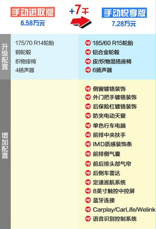 到了7.28万的手动悦享型配置就逐渐丰富了起来,主要增加了15寸铝合金轮毂以及后轮碟刹,此外8英寸安卓大屏、头部气帘、侧气囊、中央扶手、倒车雷达、定速巡航、皮质织物混合座椅成为了标配,相比入门车型贵了7千元,却多了很多实用性的配置非常值得入手。