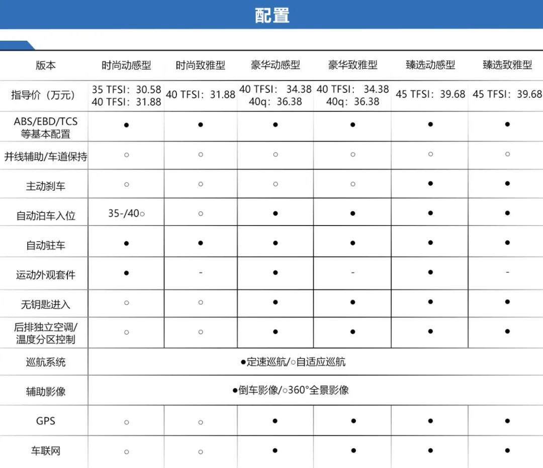 新款奥迪A4L的指导价区间为30.58-39.68万元,共推出9个配置版本。撇除动力以及quattro适时四驱的区别,可以简单粗暴地认为奥迪A4L只有6个配置版本,而且每个配置版本都有大量的选装件。在选择之前,轱辘哥建议不妨先试驾各个动力版本的车型。你如果觉得35 TFSI的动力足够,那就在这款车的基础上往上选装配件,以此类推。