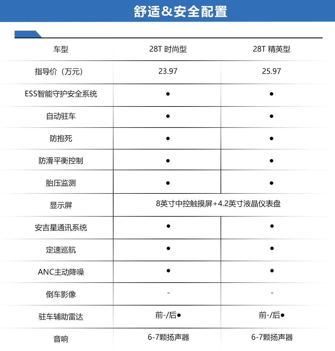 就安全配置来讲,凯迪拉克CT4的两个版本都是一致的,智能守护安全、胎压监测、自动驻车等功能都有搭载,配置水平都不低,区别只有在雷达、倒车影像等辅助类配置上。所以,如果你想买CT4主要是钟爱它的驾驶体验,对音乐、辅助类配置并没有那么高的追求,那么入手23.97万元的CT4 28T时尚型就可以了。