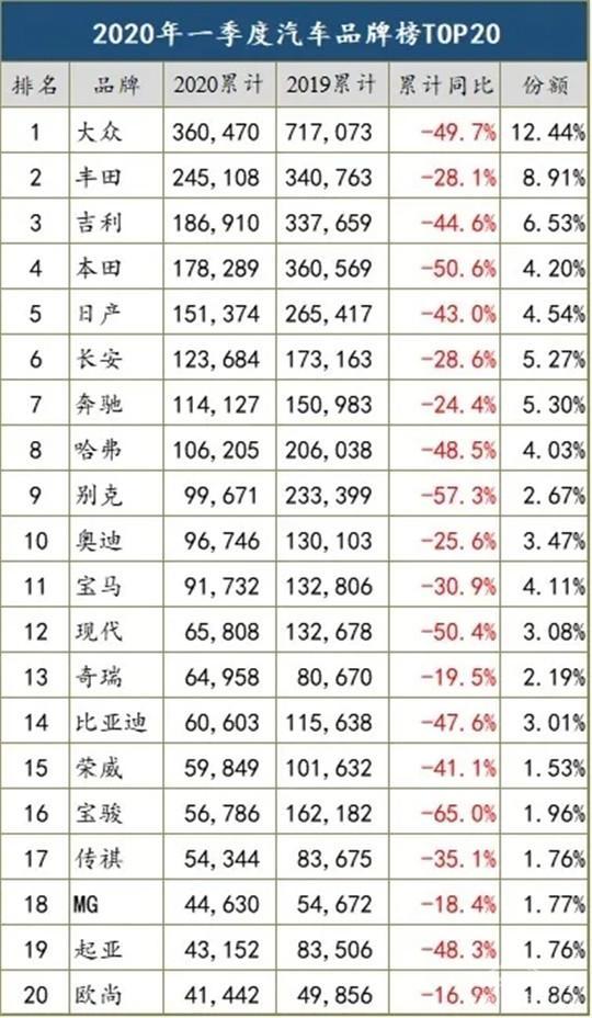 如果仅以销量来看,几乎可以用全军覆没来形容,边缘企业自不必说,连头部品牌也跌幅巨大:一季度国外品牌在华销量,大众同比下滑49.7%,丰田降28.1%,本田下跌50.6%,日产缩水43%,别克降幅达57.3%被奔驰超越,现代缩水50.4%跌出前十;自主品牌第一梯队中,吉利同比下降44%,长安下滑28.6%;哈弗降幅也达48.5%。