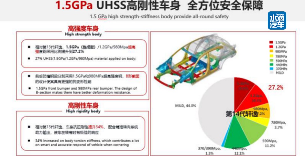 首先,在车身结构方面,轩逸的车身材质超规格采用了1.5GPa、1.2GPa、980Mpa的超高强度钢材,整车 980Mpa 以上使用比例超 27%,590MPa 以上使用比例高达 43.6%,这在同级别车型中无疑是名列前茅。