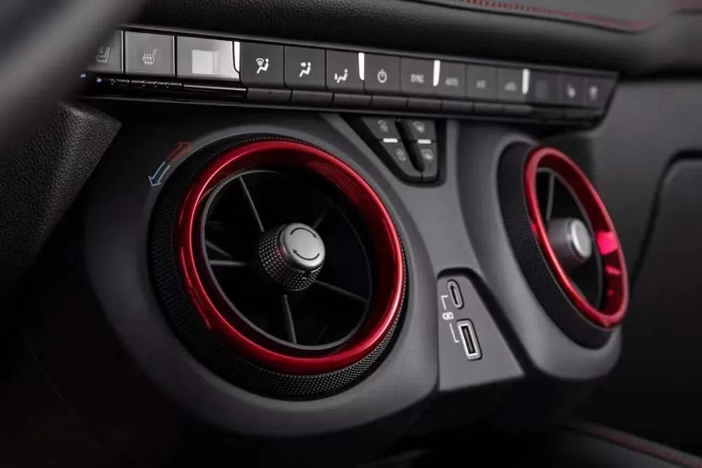 内饰设计灵感来源于自家性能跑车大黄蜂科迈罗,中控台、车门内侧、中央扶手箱均采用了大面积软质材料包裹,还配了红色手工缝线进行点缀。圆形的空调出风口设计也很科迈罗,中央的旋钮可调节空调温度,相比现在流行的虚拟触控按键而言,小编比较喜欢有实体按键的空调调节旋钮。