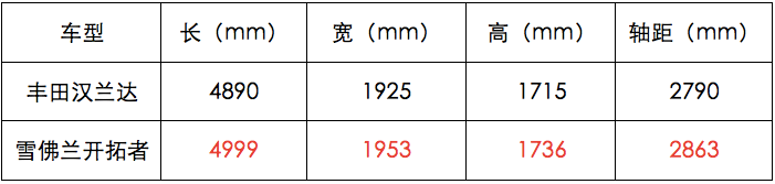 开拓者的车身尺寸长宽高分别为:4999/1953/1736mm,轴距2863mm,采用2+3+2的座椅布局。虽然在美国Blazer是一款5座SUV,但为了顺应中国消费者的需求,它摇身一变成了一款全系7座的车型。不论是长宽高还是轴距和这个级别的“元老”汉兰达对比,开拓者都有一定优势。