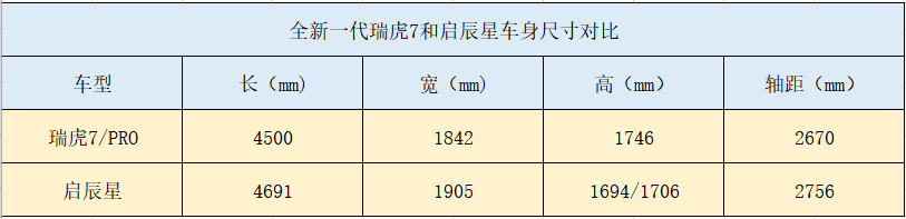 车身尺寸上,瑞虎7PRO的长宽高分别为4500/1842/1746mm,轴距为2670mm;启辰星的长宽高分别为4691/1905/1694(1706)mm,轴距为2756mm。