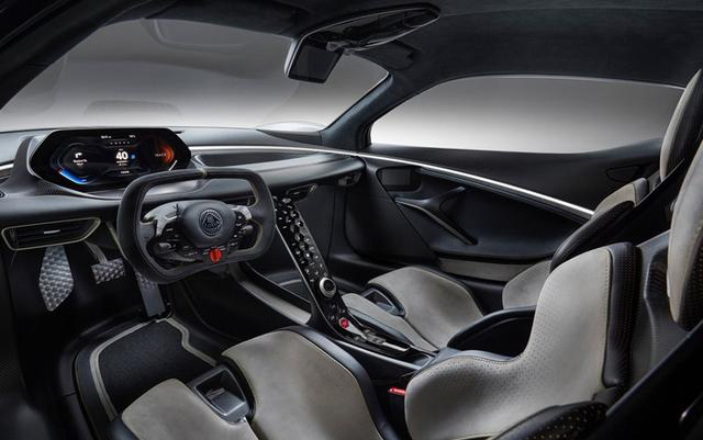 内饰方面,路特斯Evija的内饰设计极为简洁。中控台、地台采用了T字型设计,遍布于车内的碳纤维配合黄色的缝线无疑极大程度上提升了运动气息,以及F1赛车相似的矩形方向盘。此外,路特斯Evija采用了按键式的排挡设计,挡位按键采用了多边形的设计元素。