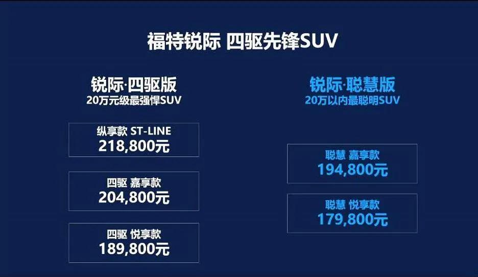 20万级别SUV标配四驱系统,是锐际上市之初最大的亮点之一,加上2.0T+8AT的强劲动力组合,毫无疑问地给锐际贴上了高性价比的标签。要知道,在同级别的热销合资SUV中,小排量发动机基本已成为主流,像本田CR-V和皓影的1.5T、大众探岳的1.4T等,而且同价位上也没有配备四驱系统的车型。因此无论从配置还是动力方面,福特锐际在合资中型SUV市场中几乎都站在了顶端位置。那么,为什么还会在此时推出新增的锐际·聪慧版车型呢?轱辘哥在后续的高管专访中找到了答案。