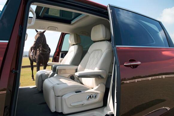 既然是豪华MPV,第二排座椅是否足够舒适显得尤为重要,新车采用2-2-3的座舱布局设计,这样就给第二排座椅的设计留出了很大的施展空间。双侧电动侧滑门,从上车的那一刻开始就充分体现出尊贵的感觉,地面为定制的长绒礼宾地毯,不但能减缓疲劳,还具有吸音、隔热、防滑的作用,顶部1.18m2的全景天窗一直延续到第二排座椅靠背顶部,使得第二排乘客一点也不会压抑。当然最重要的是行政级礼宾座椅,该座椅采用菱形格纹理的真皮材质,具有加热、通风、按摩功能,头枕不但支持高低可调,侧翼角度也可调节,对用户的头部起到充分的包裹性和支撑性。座椅扶手还带有含USB接口的储物格和隐藏式水杯放置架,此外还包含带空气净化的三区域自动空调和十色氛围灯,即使在夜晚,也可以营造温馨的乘车环境。第二排不但拥有头等舱级别的座椅,还具有舒适的乘车环境,让乘客感受到不只是简单的乘坐,更是一种高级的享受。