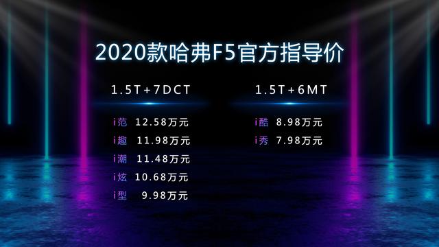 4月20日,2020款哈弗F5正式上市。新车搭载1.5T涡轮增压发动机,匹配6速手动或7速湿式双离合变速箱,共推出7款车型,官方指导价区间为7.98-12.58万元。购车还将享受智趣互联礼、新车首发礼、金融购车礼、健康用车礼、置换补贴礼。