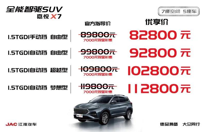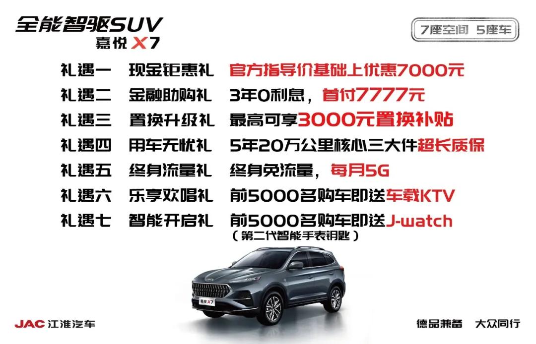 与此同时,江淮还在上市期间推出了订车七大礼遇,其中包括了7000元的现金优惠,以及3年0利息、最高可享3000元置换补贴、5年20万公里核心3大件超长质保等等。