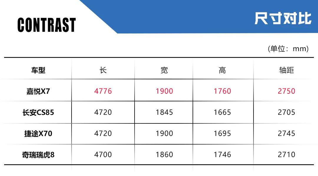 不仅如此,嘉悦X7的车身尺寸也竞品车型要强,尤其是2750mm的轴距,让整车达到了七座SUV的空间水准,另外还配备了如此丰富的配置以及双独立悬架,整车的乘坐舒适性也会比竞品更有保证。