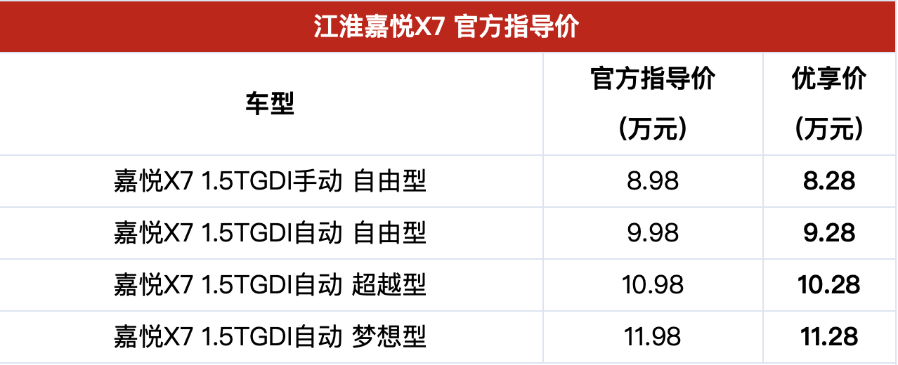在家轿车市场取得的成功,更加坚定了江淮3.0时代的步伐。4月20日,在万众瞩目下江淮乘用车发布了全新车型——嘉悦X7,共推出4款车型,官方指导价8.98-11.98万元,全系车型现金钜惠7000元,实际用户优享价8.28-11.28万元。