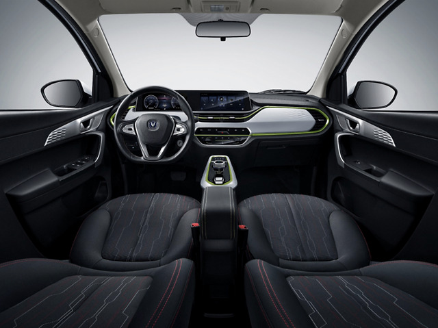 内饰方面,奔奔E-Star车内提供了极具科技感的全液晶仪表以及悬浮式中控屏,采用黑/白双色搭配,让内饰设计显得非常活泼,十分适合年轻消费者。新车还使用了旋钮换挡设计,内饰设计感较强。同时后方配有电子手刹。