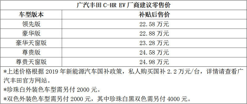 (2020年4月22日,广州)C区玩家抢先触“电”,基于丰田电动化技术和丰田QDR而开发的高品质纯电SUV——广汽丰田C-HR EV正式登场,新车提供五大配置版本、八种可选车色,全系列产品厂商联系零售价22.58万-24.98万元,即日起全面发售。