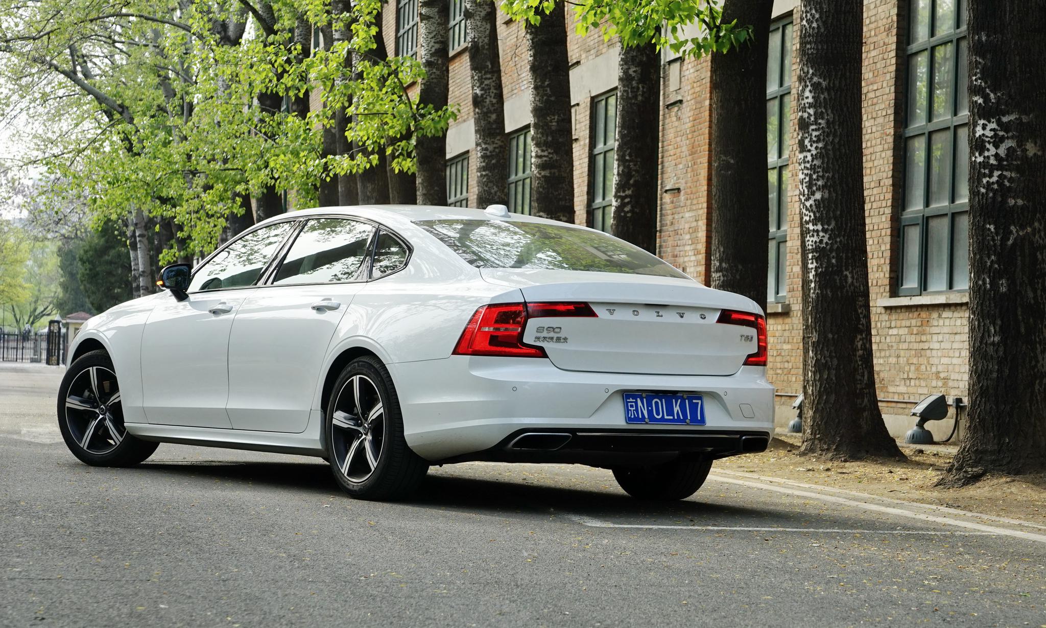 大概是白色涂装的缘故,眼前这台沃尔沃S90少了几分庄重,也使得视觉效果更紧凑。从侧面看修长的车身,就会觉得说,“Wow,这个后车门可真长”。不过从后45度角拍摄S90,又会发现整车的姿态很稳定,尤其是长长前“脖子”,为这台车添彩不少。