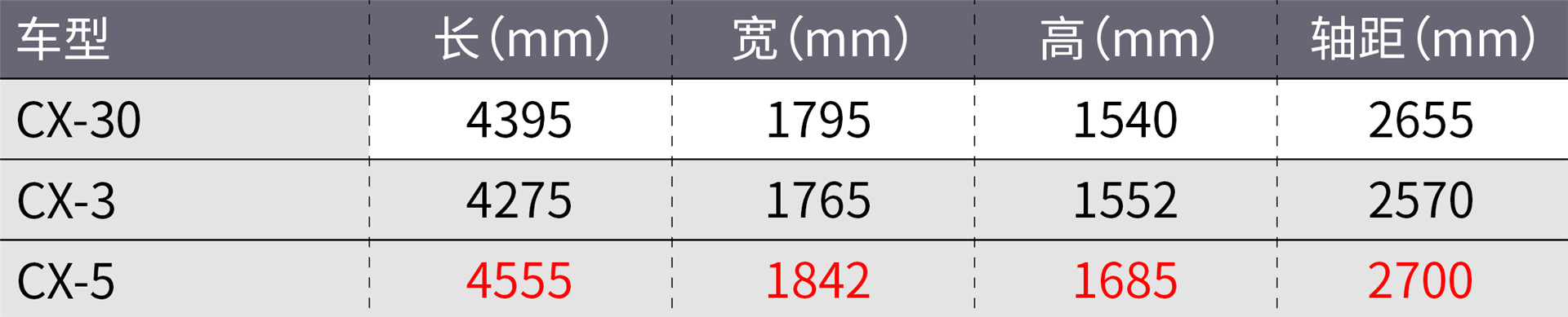 尺寸方面,CX-30的三围尺寸介于CX-5和此前的CX-3之间,不到4.4米的车长更符合小型SUV的身材,而轴距甚至比马自达3还短了71mm。