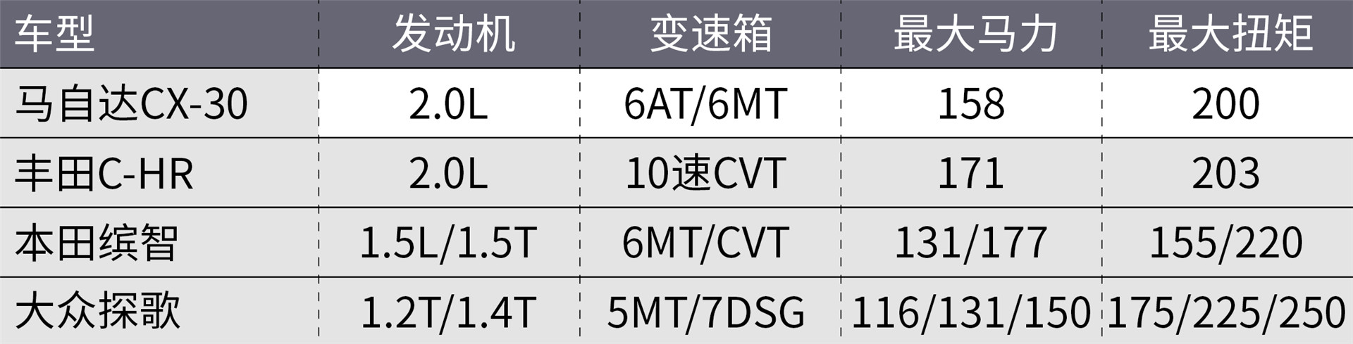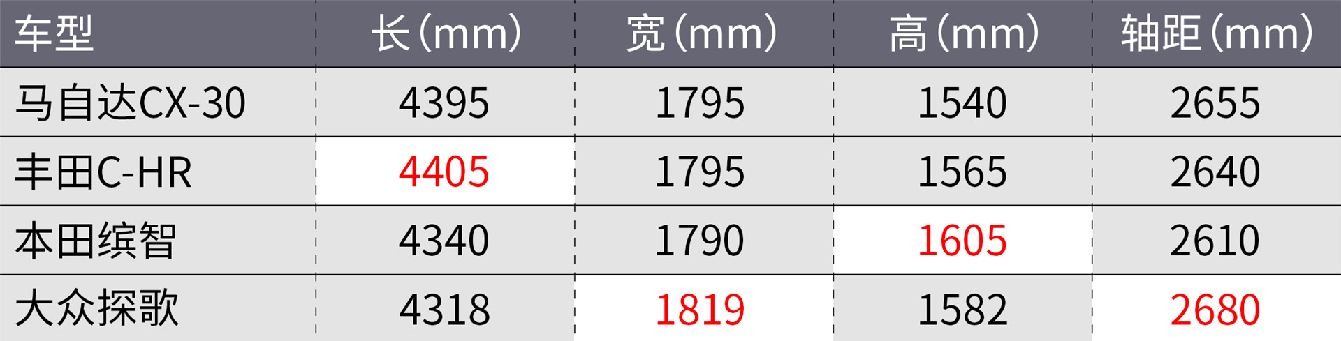 从尺寸来说,CX-30的车长略逊于C-HR,比本田和大众要更长一些。轴距则介于加长后的探歌和C-HR之间。有意思的是,CX-30的高度是同级别竞品里最低的,更符合其偏向跨界风的定位。