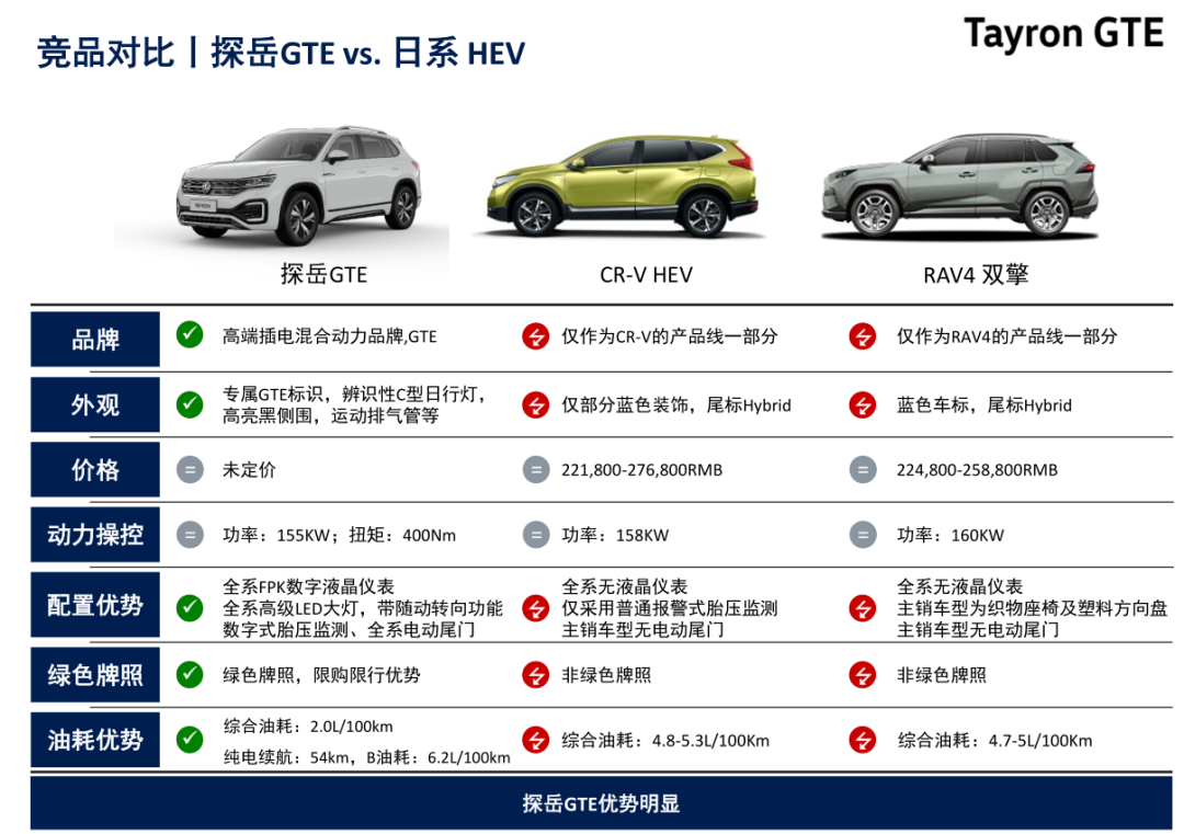 另外,相对比较畅销的混动SUV还有本田CR-V HEV和丰田RAV4双擎。与两款日系车型相比,探岳GTE不仅拥有专属新能源车的外观配置,而且其综合油耗会更低,还有上绿牌的优势。