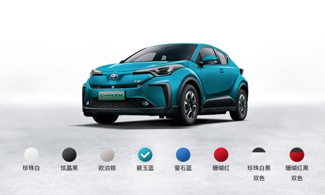 车身颜色同样是外观的一大亮点,C-HR EV全系拥有8种车身颜色,包括6个基本颜色,及2种双色车身颜色。其中,萤石蓝为C-HR EV专属车身色。