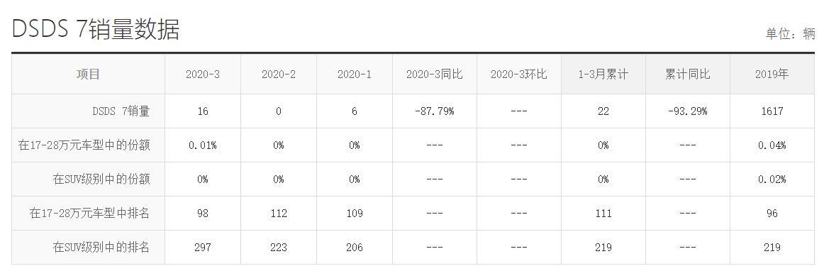 具体来看,3月DS7一共卖出16台,排名所有SUV车型中第230位。2月份销量是0台,当然这也跟疫情原因有关。再看到1月,1月份比2月份好点,新车一共卖出了6台,算是开了张。就这样,长安标致雪铁龙DS7在2020年1-3月一共仅售出了22辆,累计同比增长-93.29%。在2019年,DS7还卖出了1617辆的年销量,可按照如今这个销售势头,DS7还能"活"多久我们都不得而知。如果再结合前一阵子雷诺那事儿,估计DS退华可能也就只是迟早之事了。