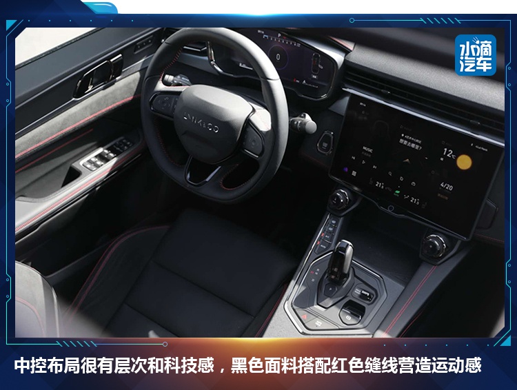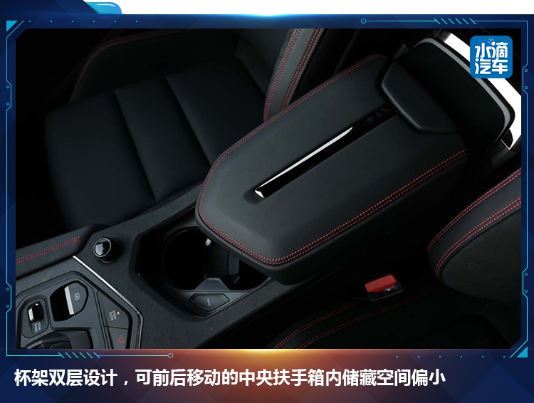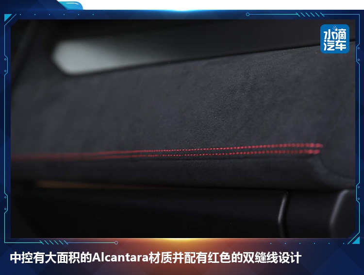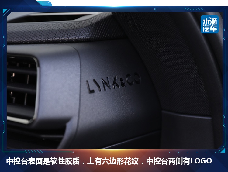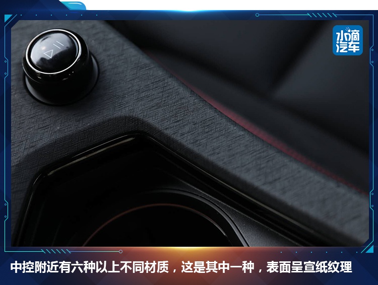 说完好玩和科技,接着谈精致。领克05细节做工很到位,笔者粗略得数了一下,中控的使用的材料不下六种:Alcantara翻毛、钢琴烤漆、镀铬、铝制版、宣纸纹理、塑料、几何切割橡胶等。正是因为多种材料的搭配,虽整体以黑色为主,中控层次感非常好,再辅以红色缝线,运动感很强。