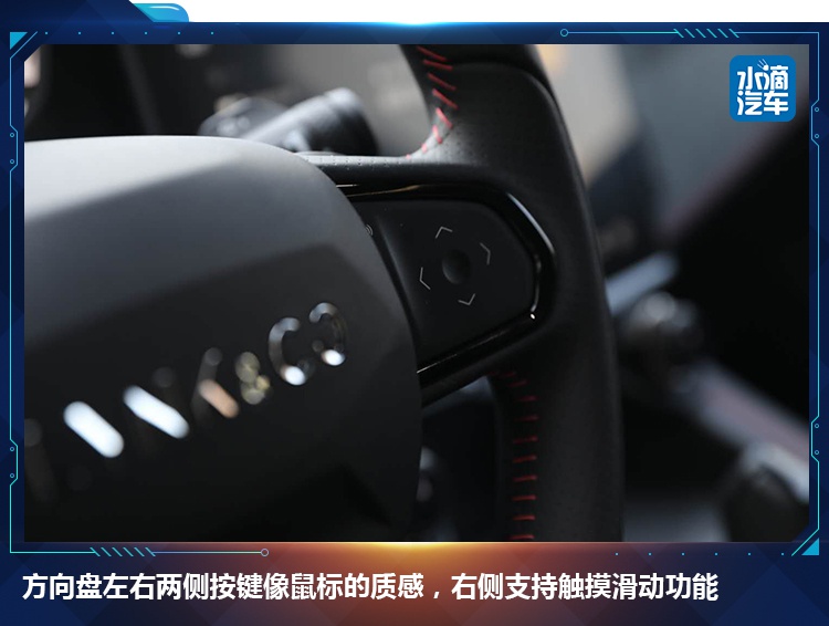 好玩和科技还有炫酷是同时存在的,好玩的前提是科技的支持,由科技武装的好玩就成了酷炫,比如下面这个细节,领克05方向盘左右按键是模拟了鼠标的质感,磨砂质地手感很细腻,将鼠标放在方向盘上,科技感有了,再加上12.3英寸全液晶仪表盘和7.5英寸全彩HUD抬头显示,有了那么几分通过鼠标打极品飞车游戏的感觉。