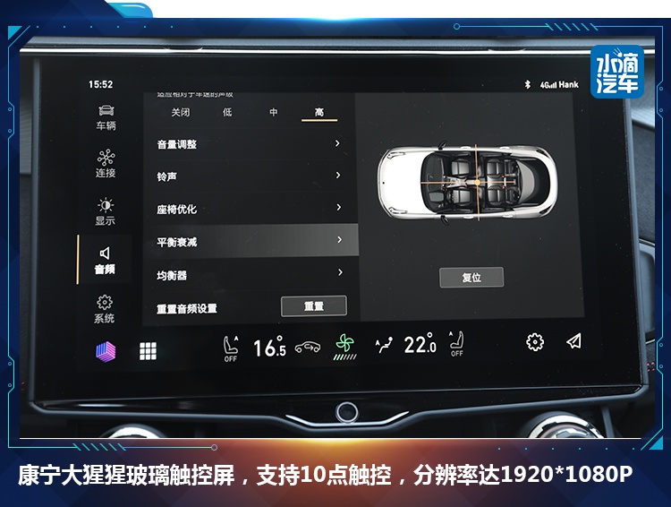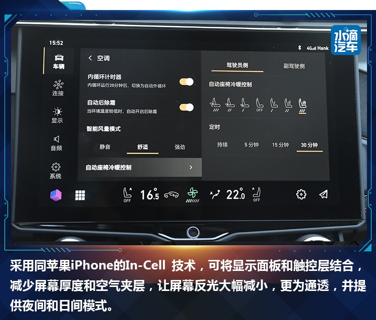 触控屏来自JDI,采用低温多晶硅技术LTPS产线,从侧面看这块屏幕非常薄。另外屏幕反应灵敏的背后是芯片的支持,领克05使用了高通骁龙820A车载芯片,采用64位四核处理器,搭配4GB DDR4内存,及64GB高速固态闪存硬盘,支持600Mbps的高速LTE移动上网速率。