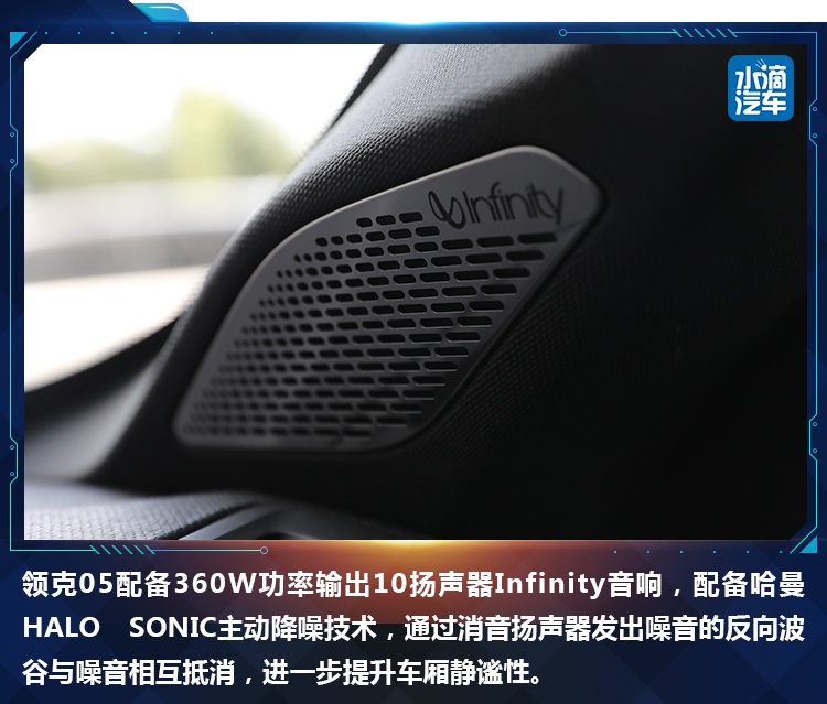 静态的细节做得很精致之外,能动的物件也做了精心处理,比如空调旋钮的阻尼感、副驾驶位置的扶手箱开启,车窗玻璃升降的速度也明显经过了调教,很柔和。当然笔者试驾的顶配领克05装载了360W大功率输出的10扬声器Infinity高级音响,音响效果很棒,再加上Clari-FiTM 、Logic 7®等功能,能够遗世而独立,给你寒江孤影,我自逍遥的独立感。