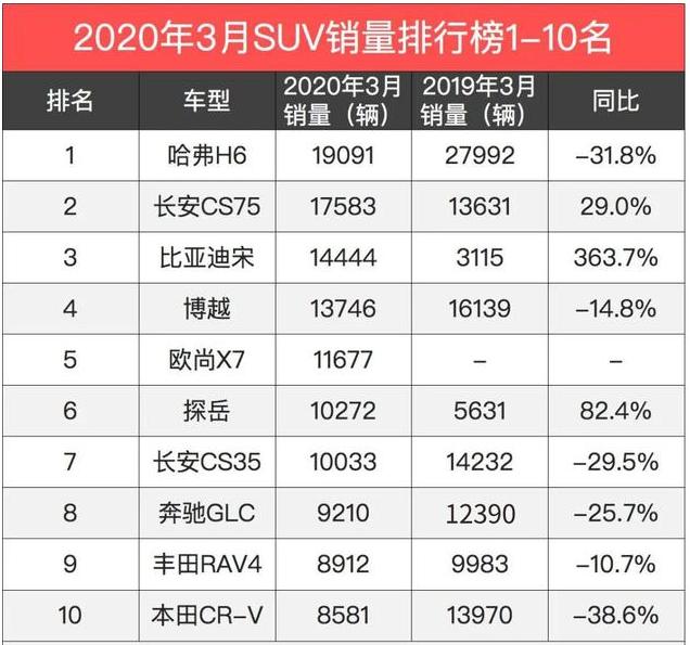 今年3月汽车市场相比往年有了翻天覆地的变化,受到疫情影响,全国大部分地区都是3月开始复工,人们对汽车的需求明显增多,在汽车市场不景气的大环境下3月销量逆市上涨,其中SUV销量榜单更是吸引了众人的眼球,国产SUV霸榜前5,其中有四款是热销持续的经典车型,第五名则是刚刚上市没多久的欧尚X7。