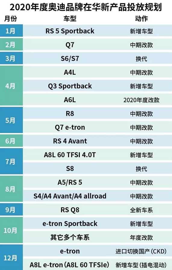 2020年是奥迪品牌产品大年,奥迪计划在中国市场推出20余款车型,其中有5款纯电动车型,插电混合动车型也将增加至12款。其中不乏像A3、Q3 (配置|询价) Sportback这种适合年轻消费者的新车,也有代表新能源的e-tron Sportback,而R8将会步入生命的最后的周期