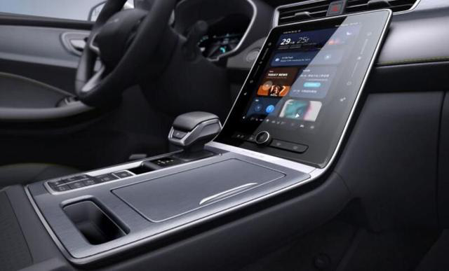 中控台上,是一个大尺寸曲面液晶屏,该屏整体设计纤薄,采用2.5D全贴合式玻璃面板,很有现代感、科技感与品质感。