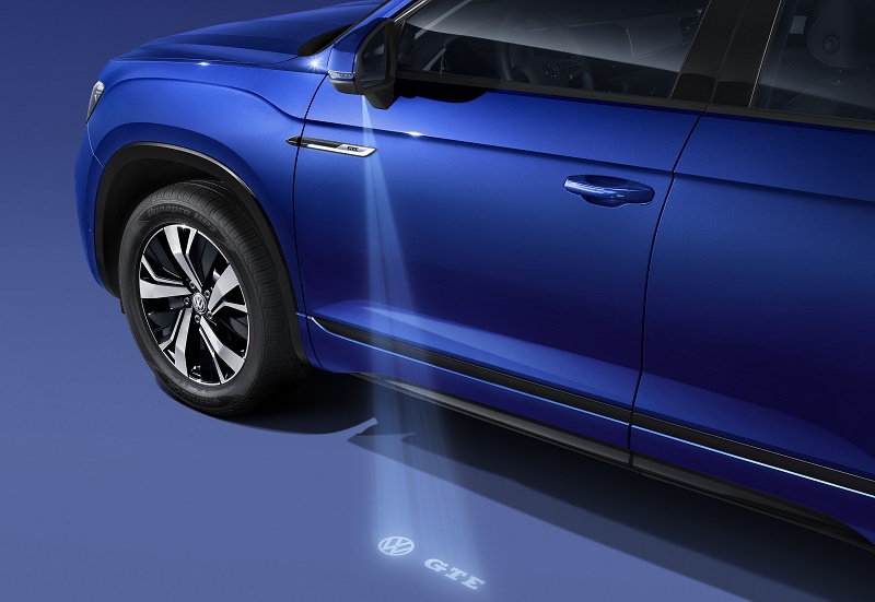 车身侧面,在侧裙上增加了高亮黑色裙边,换装了全新的18英寸低风阻轮圈。前翼子板处有专属的GTE标识,夜晚会亮起白色的灯带。外后视镜下方增加照地灯,会投射出VW大众标和GTE的字母。