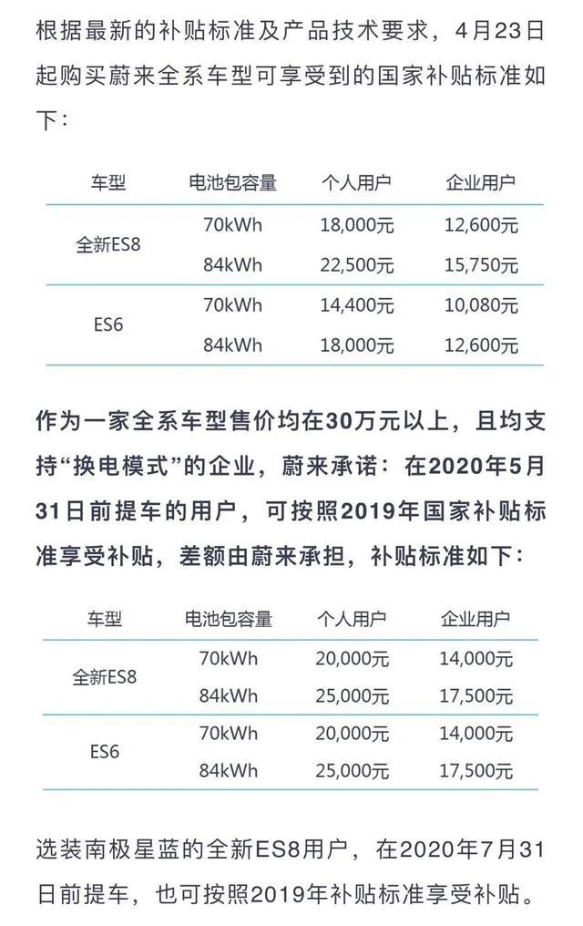 同为造车新势力的蔚来也迅速响应政策。ES6/ES8均支持“换电”,所以该品牌两款车型会面临补贴退坡,并不会完全取消补贴。根据最新的补贴标准及产品技术要求,列出了4月23日前个人购买全新ES8和ES6的价格。相比2019年的补贴额度,有不同程度下滑,差价最高达7000元。但对于在5月31日前提车的用户,差额将由蔚来承担。