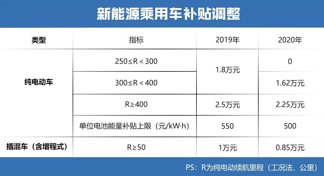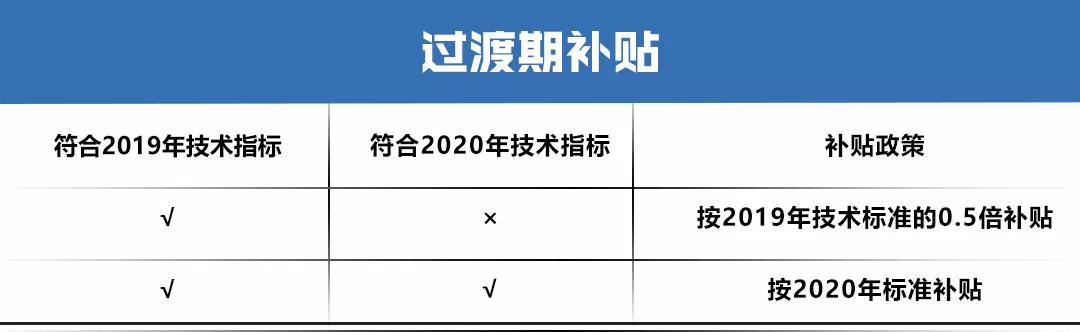 另外,《通知》中还设置2020年4月23日至2020年7月22日为过渡期。在这过渡期之间,将会按照2018年对应标准的倍数进行补贴。符合2019年技术指标要求但不符合2020年技术指标要求的销售上牌车辆,可以拿到的补贴为2019年新政规定的一半;符合2020年技术指标要求的销售上牌车辆可直接按2020年新政标准给予补贴。