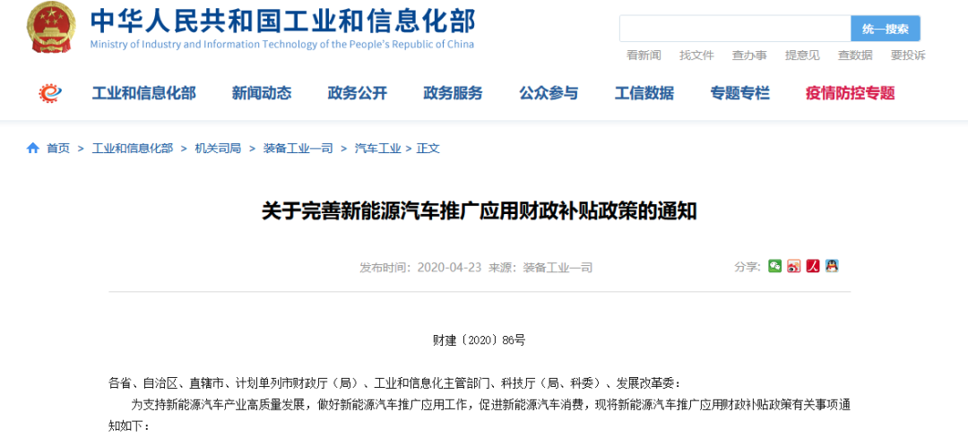 今年3月底,新能源汽车购置补贴和免征购置税政策延长2年等重大举措被推出。4月23日,财政部、工信部、科技部、发改委联合发布《关于完善新能源汽车推广应用财政补贴政策的通知》(以下简称《通知》),该《通知》明确了将新能源汽车推广应用财政补贴政策实施期限延长至2022年底。