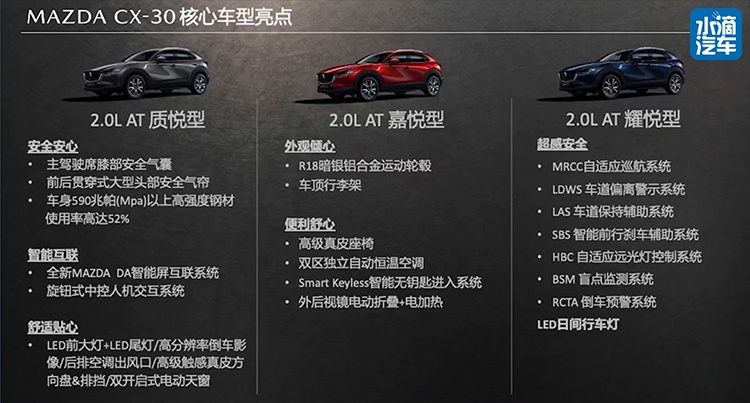 今日,长安马自达CX-30 正式开启预售,预售价格区间为12.99万元-17.69万元。新车将推出1款手动档和7款自动挡共8款车型,提供水晶魂动红、铂钢灰、晶钻蓝、极境灰、珠光白5种车身颜色供用户选择。新车即日起接受预定。此外,本次预售还公布了3款自动档车型—2.0L AT 质悦型、2.0L AT 嘉悦型、2.0L AT 耀悦型的主要配置亮点。可以说,长安马自达CX-30的到来为马自达品牌打入了一支强心剂。