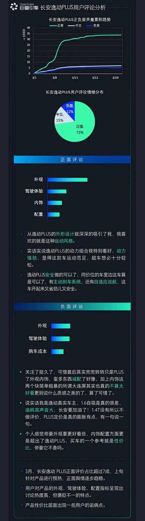 从舆情分析来看,长安逸动PLUS的热度在3月份虽有波动,但整体颇高。在用户情绪中,中立评论占比15%,负面评论占比12%,足以见得消费者对长安逸动PLUS认可度。从评价看,用户对长安逸动PLUS的外观、驾驶体验、配置的讨论较多,但褒贬不一。