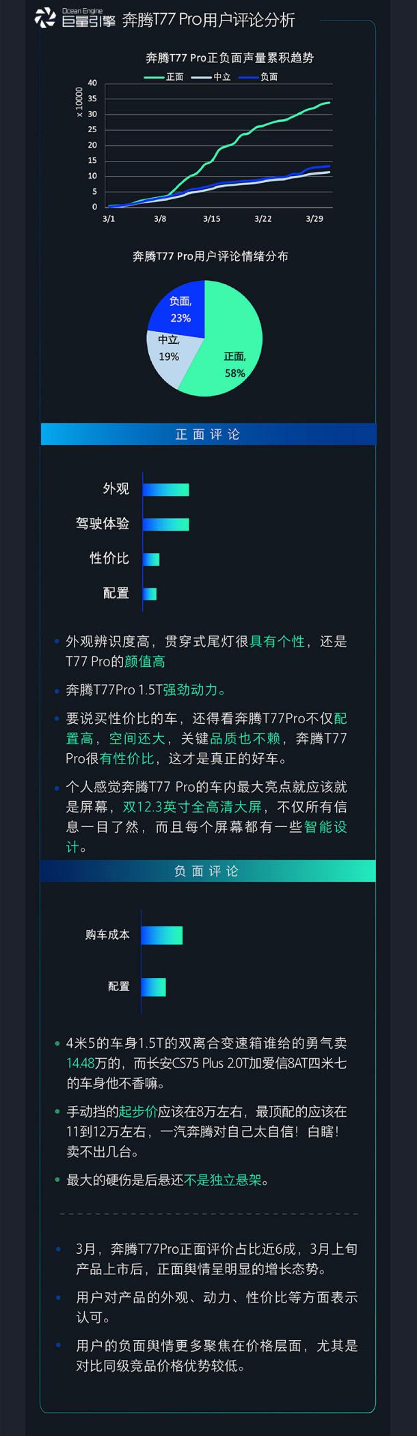 从用户评论分析,奔腾T77 PRO的高颜值和强动力广受消费者认可,此外还有双12.3英寸高清大屏等凸显科技感的智能配置。而负面评论多集中在价格层面,对比同价位竞品稍显劣势。对此,可通过继续强化线上直播的方式进行产品力传播。对于价格层面的诟病,可通过突出产品优势点、性价比降低用户的负面评价。