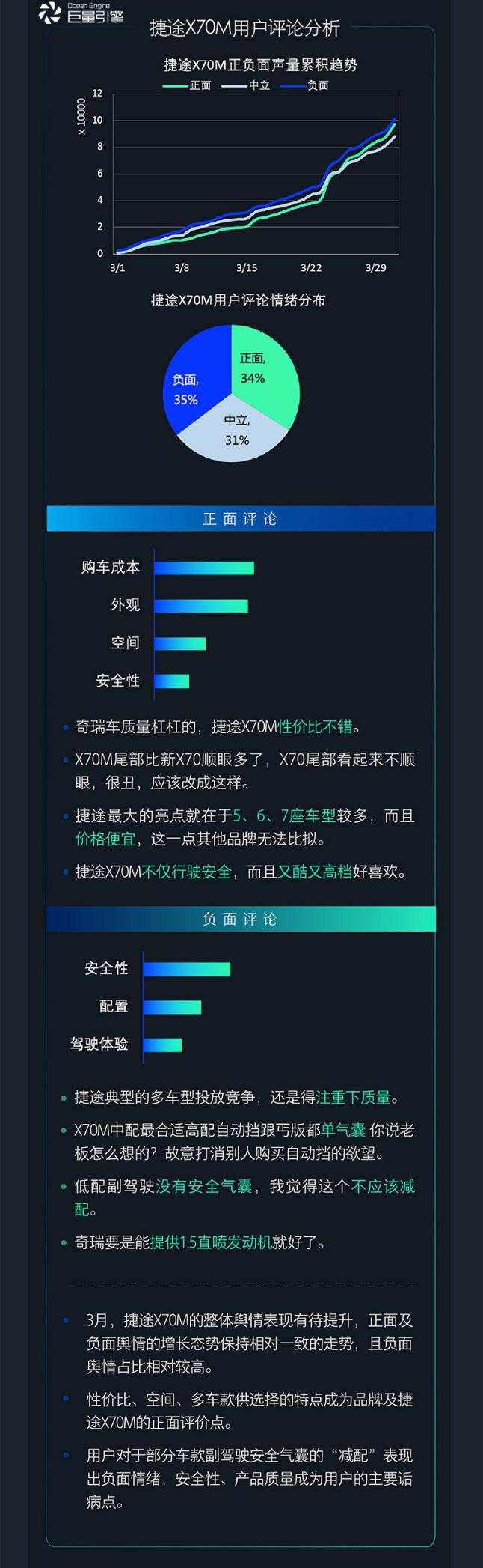 从分析结果看,捷途X70M在3月份的前两周热度相对稳定,后两周热度逐渐提升,上市时出现峰值,热点内容多集中在产品力方面。从舆情角度看,捷途X70M负面评论为35%,中立评论为31%,正负面评论增长态势相一致。暴露出的问题比较明显,在于部分车型的安全性以及质量上,被用户所诟病。