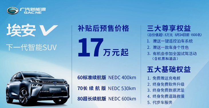以上便是关于广汽Aion的全部内容,Aion V对于订车用户,官方推出了免费送充电桩、终身免费软件升级、终身免费数据流量、终身免费道路救援和代步车服务。同时对于5月24日前订车的前1500名消费者,还将赠送一键遥控泊车、车身个性色、以及参加试驾活动的机会。
