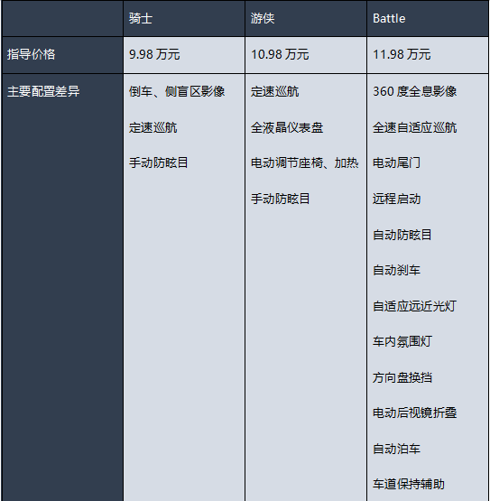 此次缤越PRO共计推出了五款车型,分别是搭载1.4T发动机的射手、猎手,以及搭载1.5T发动机的骑士、游侠、Battle。