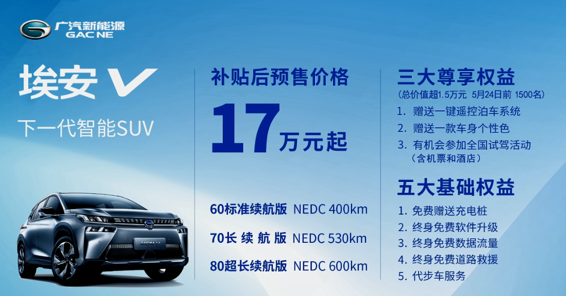 4月27日,广汽新能源Aion V (配置|询价)正式开启预售,新车共推出3款车型,补贴后预售价格17万元起。