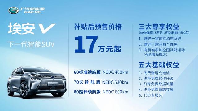 2020年4月27日,广汽新能源埃安V通过线上直播形式公布预售价并正式开启预定,新车预售价为17万起。新车基于GEP2.0全铝纯电专属平台进行打造,并将首次搭载5G+C-V2X智能通讯系统,搭载华为新一代5G车载模组MH5000,广汽新能源埃安V最大续航里程可达600km。另外,即日起消费者可以通过广汽新能源APP在线预订埃安V,即可享受免费赠送充电桩、终身免费软件升级、终身免费数据流量、终身免费道路救援、代步车服务等五大基础权益;5月24日前预订的前1500名用户更可免费获得一键遥控泊车、车身个性色以及有机会参加新车全国试驾活动(含酒店及机票)等价值1.5万元的三大尊享权益。