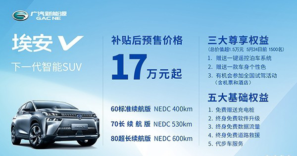 我们了解到,消费者可以通过广汽新能源APP在线预订埃安V,即享受免费赠送充电桩、终身免费软件升级、终生免费数据流量、终生免费道路救援、代步车服务等五大基础权益;5月24日前预订的前1500名用户更可免费获得一键遥控泊车、车身个性色以及有机会参加新车全国试驾活动(含酒店及机票)等价值1.5万元的三大尊享权益。