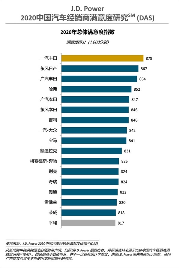 一汽丰田、东风日产、广汽丰田分列《2020年中国汽车经销商满意度研究(DAS)报告》前三甲;在1000分制的调查中,其分别得分是878、867、864。这也是一汽丰田连续第二年在该项调查中获得第一名,书写了“蝉联”。