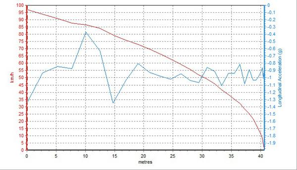 由于是湿地,轮胎的抓地力有所降低,测得的刹车距离自然会变长。畅巡在初次100km/h-0测试中获得了42.3m的成绩,在湿地测试中,这个成绩是挺不错的。从曲线图我们可以看到初段减速度可以达到-1.3g,刹车系统初段能提供足够的制动力,但是随后轮胎开始发生打滑,ABS系统介入,减速度发生较大波动,迅速升高到-0.4g,最后又回到-1g左右。
